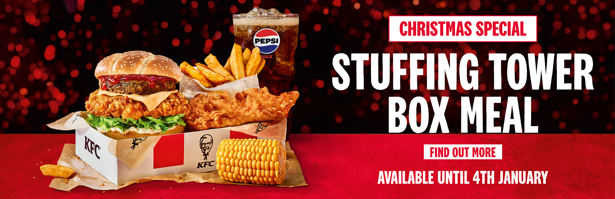 This festive season, unbox our Stuffing Stacker Burger, it’s loaded with Two Original Recipe fillets, Sage and Onion Stuffing, Cheese AND Cranberry Sauce. It’s Christmas, in a bun. If you don’t want to get stuffed with a stacker, choose the Stuffing Tower Burger. An Original Recipe Fillet, Sage and Onion Stuffing, Cheese and Cranberry Sauce. The Stuffing Tower Burger is available as box meal, so don’t forget to get yourself a gravy.
