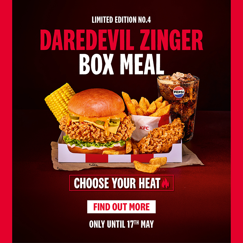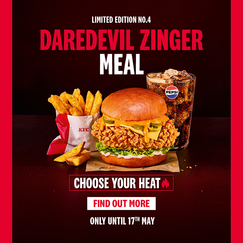 Ready to test your limits? The NEW Daredevil Burger range has landed, bringing a three-level full-on heat challenge designed to dial up the spice, choice, and talkability! Featuring our iconic spicy Zinger fillet, melted cheese, sliced jalapeños, crisp iceberg lettuce, and a new spicy habanero bun, the power is in your hands to choose your heat. From Sweet Chilli to Supercharger to Sriracha Firecracker – how hot do you dare to go?
