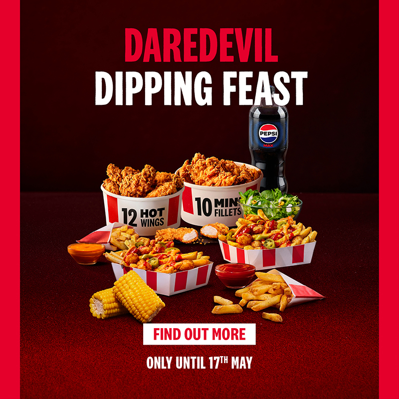Available from 20th April 2026 until 17th May 2026 and while stocks last. Participating restaurants & delivery partners in the UK & ROI only. Delivery fees apply. Subject to availability. KFC reserves the right to withdraw the products at any time and without notice. Participating restaurant trading hours apply. KFC name, design and related marks are the intellectual property of Kentucky Fried Chicken (Great Britain) Limited © 2026. All rights reserved.